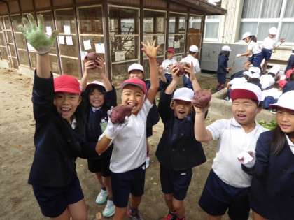 先生の指示をしっかり聞いて、まずサツマイモの葉とツルを取り除きます。それだけで、顔をだすたくさんのサツマイモ。