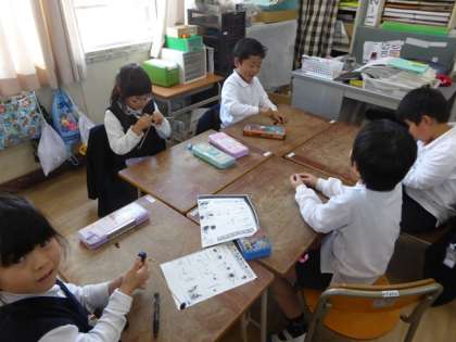 「ドングリ」をつかっておもちゃを作ると聞いて1年1組へ。