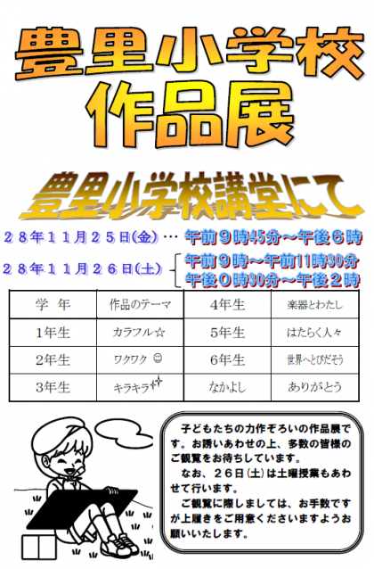 11月25日(金)・26日(土)は2年に一度の『作品展』を下記の要領で行います。ぜひ、子ども達の力作を鑑賞しにご来校下さい。