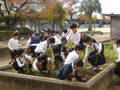 その合間をぬって、職員室前中庭の学習園の整備を行なっていました。