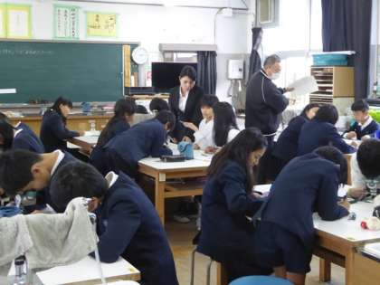しっかりとした授業案を作成し、管理職を含む複数の教員が授業を見学します。授業が終わった後は、授業に関しての批評・高評です。