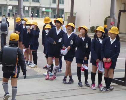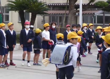 「走ったら、あぶないでぇ。」「あいさつ運動やねん。」その後も、予定の時間を待たず児童が集まってきます。あいさつ運動が始まると、並んでいる列がドンドン前へ。道幅が狭く狭くなっていきます。取り組み気持ちが本当に前向き。