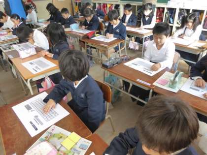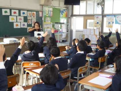 TVはもちろん、色絵カード、DVD,CD,デジタル教材、プロジェクターと全ての機器をフル活用し、子ども達も次から次へとだされる指示にこたえていきます。なかなか見事です。