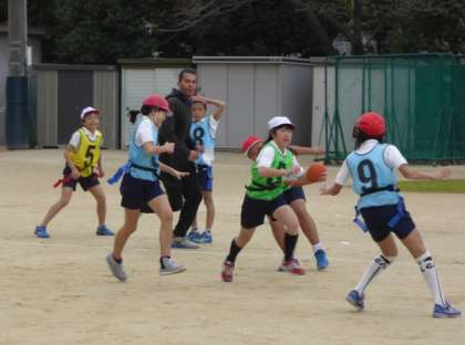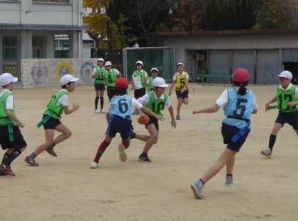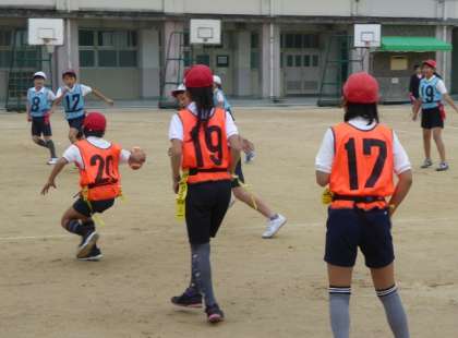 5年生が取り組んでいる新しいスポーツ「タグ・ラグビー」