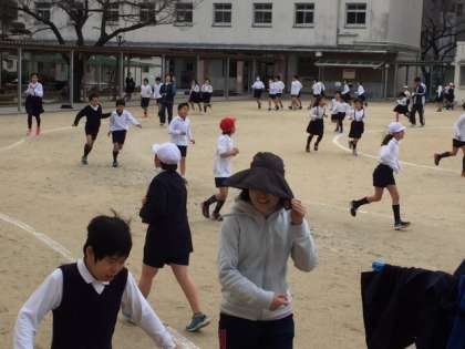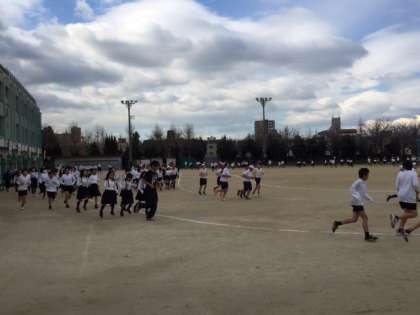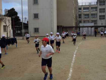 寒風吹くいまいちのコンディションでしたが、今日の15分休みに2・4・6年が最初の1周は担任の先生の先導で、2周目からは各自のペースでは音楽に合わせて走りました。