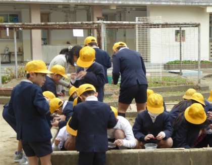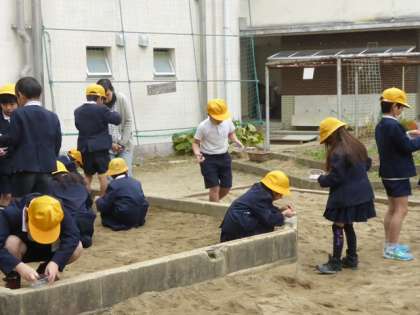 中庭の砂場で、磁石をつかって「砂鉄」を探しています。