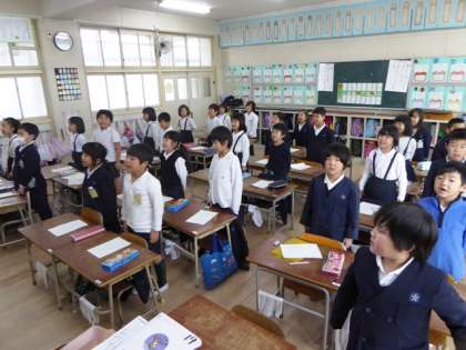1年2組が「6年生を送る会」の歌と呼びかけの練習中でした。