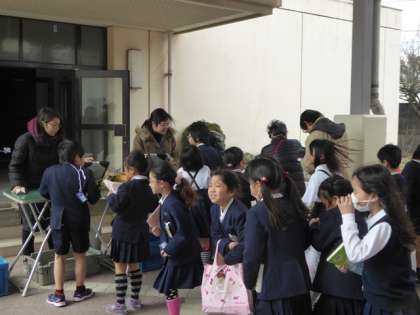 地域や保護者の方々とともに、休み時間には、かばん一杯に借りていた本をいれた子ども達がぞくぞくと集まってきます。