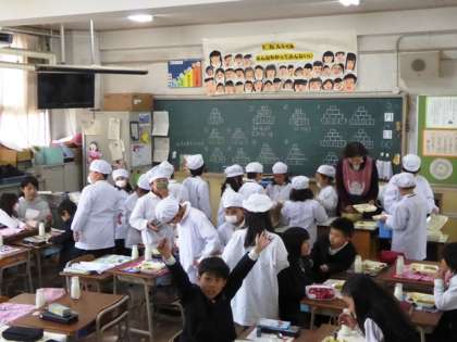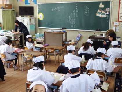 今日も、習熟少人数の高見先生、放課後ステップアップの西原先生が給食の時間に1・2年生の教室へ。