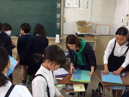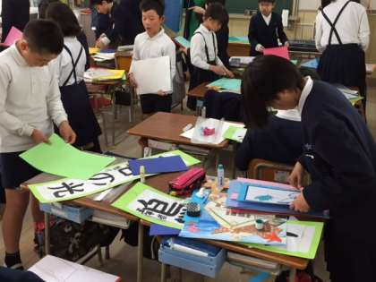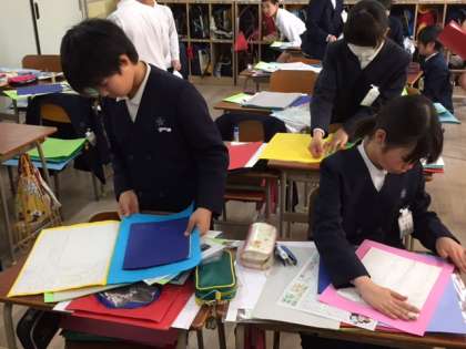 5年2組の教室では、図工作品や子ども達が書いた新聞をまとめた作品集作りの真っ最中。
