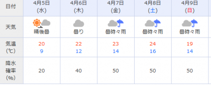 「週間天気予報」を見ると、7日(金)の入学式の日には「雨マーク」。今年も思い切って、前日の学校開放を・・・を検討中です。