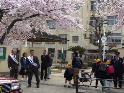 新しくこの4月に赴任した北岡東淀川区長や警察署長を始め、たくさんの関係諸機関や地域の方々も、見守りを兼ねてあいさつ運動に参加していただきました。本当にありがとうございました。