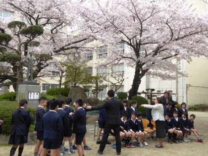 満開に咲き誇る桜の花をバックにみんな最高の笑顔です。