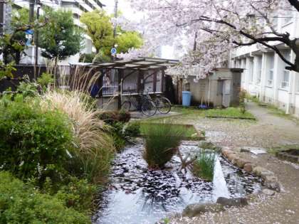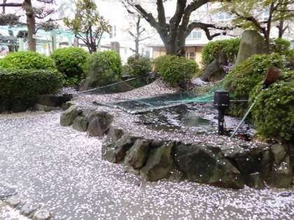 一足早く咲き出した中庭やビオトープの桜にとっては、うらめしい「花散らしの雨」、桜のじゅうたんが一気に敷き詰められました。