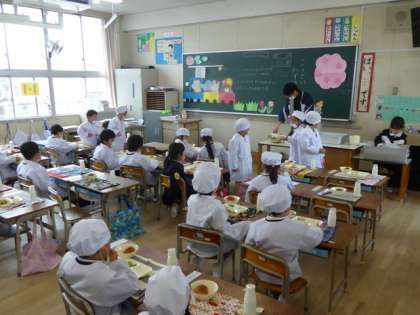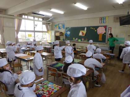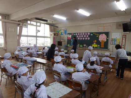 1年生だけ給食の準備スタートは、3限終了後すぐの11時30分、約1か月間は6年生のお兄さん、お姉さんが教室まで運んできてくれます。