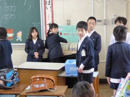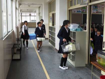 6年生のお姉さん・お兄さんが、牛乳や食器などを1年生の教室に運んでくれます。