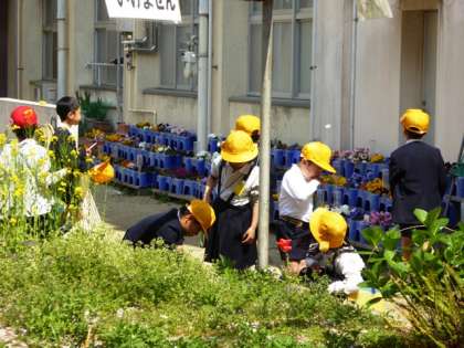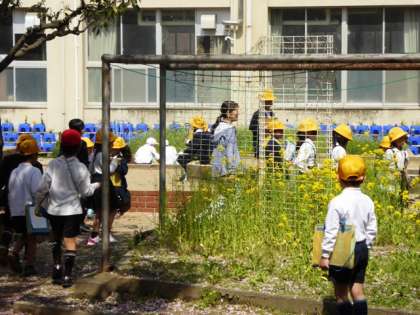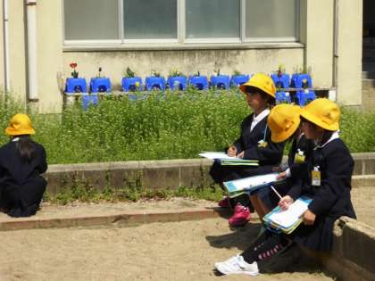 先生に連れられて、校庭まわりをぐるりと一周、最後に中庭で春さがしです。サクラに、菜の花、ちょうどモンシロチョウも飛んでいました。