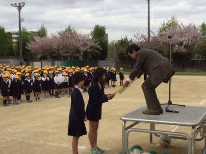曇り空の中、1年から6年生までが初めてそろった「児童朝会」