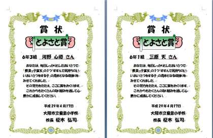 「頑張っている児童を応援する」という目的で、今年から新しく『とよさと賞』を創設しました。選定は担任の先生方の推薦も受け付けますが、基本は校長の独断(笑)