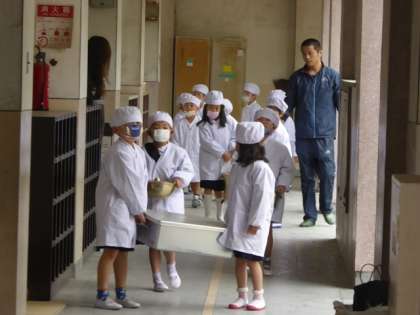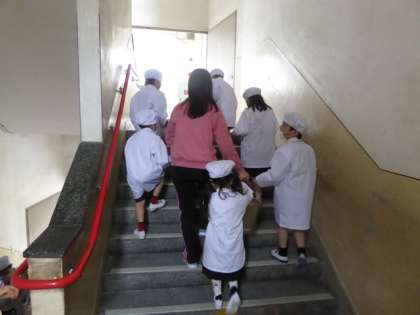 給食室からの食器や食缶(おかずやパン・ごはん)を運ぶのが本当に大変そう。特に階段にさしかかると見ているだけでハラハラします。