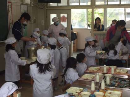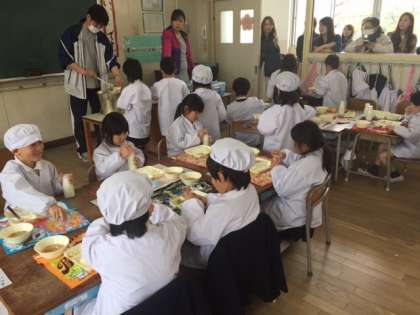 今日は、小学校に入学して初めての参観日。お家の人たちに給食の様子を見に来てもらっています。