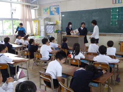 1年生にも、絵本の読み聞かせの楽しさを知ってもらおうと、5・6年生の図書委員が1年生の教室に足を運んでくれました。