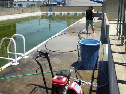 6月のプール開きに向けて、早くも始動。管理作業員さんが高圧洗浄機を使ってプールサイドの汚れを落とし始めています。