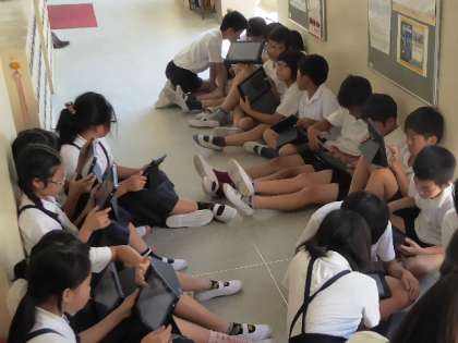 「校長せんせぇ、すいません。どうしても教室ではネットにつながらないんです。この廊下でようやく・・・」