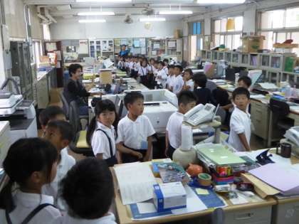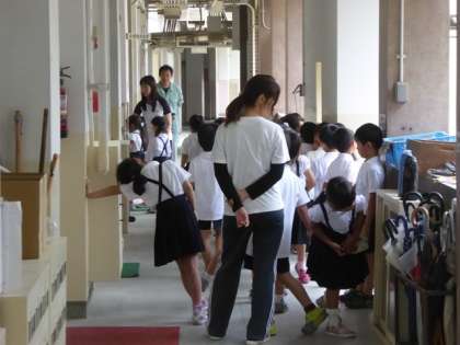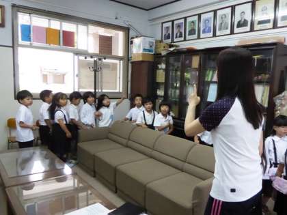 1年生の児童が担任の先生に連れられて、学校内を回っています。