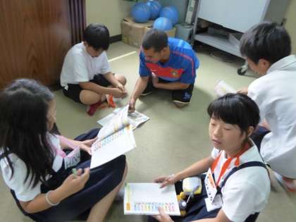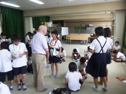 最後は、自由に動いて友達の誕生日を聞きに回ります。ジュリアン先生や佐藤先生も参戦。ちょっとドキドキの英会話です。