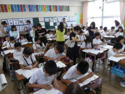 全教員が交互に授業を参観し、成果と課題を整理してメモして行きます。