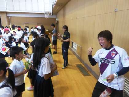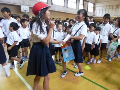 ばらばらに散った集会委員とのじゃんけん、勝てばカードをゲットです。カードをたくさん集めた児童が優勝ですが、「スタート!!」の合図とともに長蛇の列。