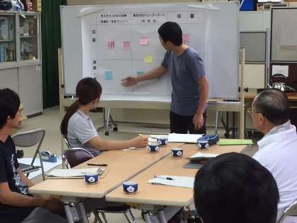 研究討議会では6人ごとの小グループで、授業についてのメモや質問事項を集約して大きな紙にまとめ、全体の前で発表します。