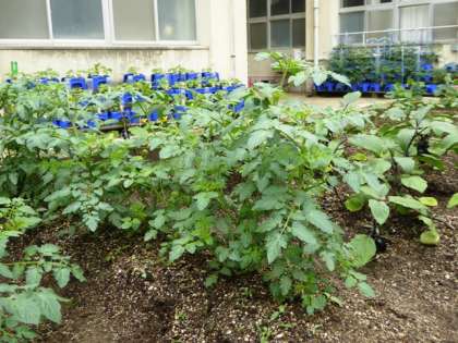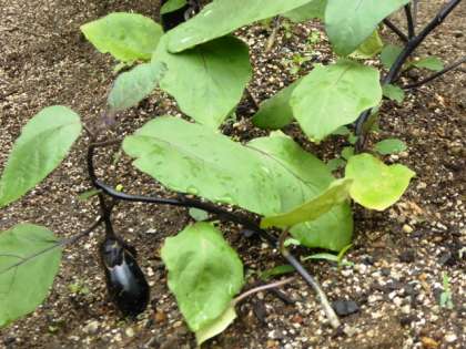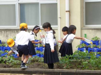 毎日、自分たちの植木鉢のアサガオと野菜畑にたっぷりの水をあげています。おかげで、早くも小さなナスビが実り始めました。これからの生長が楽しみですね。