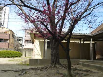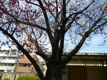 上の写真では、桜の花が早くも咲き始めているように見えますが、正しくは2枚目下の写真。前の梅の花が満開、後ろの桜はまだまだ「つぼみ固し」です。  (学校長)