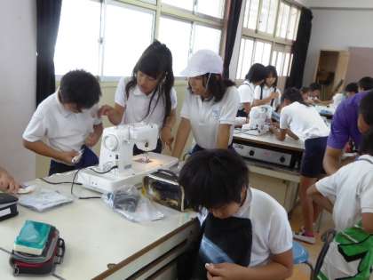 6年1組の家庭科の時間「エプロンを作ろう」です。