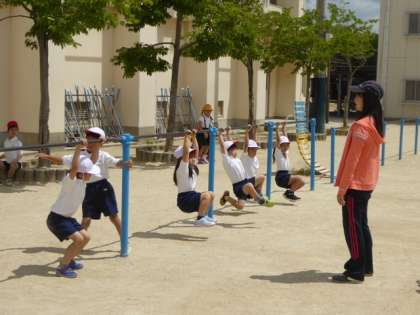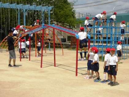 鉄棒と遊具のまわりには、1年生の3組と4組。