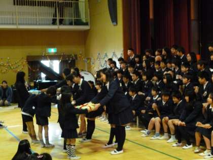 1枚目:卒業生から在校生への記念品授与(手作りの雑巾)