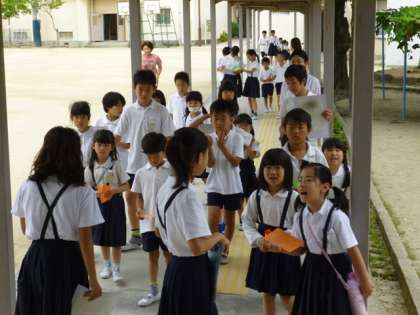 1年生から6年生まで、5・6人の60班の縦割り班ごとに。