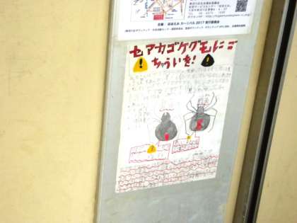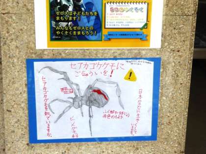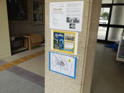 「セアカゴケグモの注意ポスターを作ったのではってくれませんか?」ということなので喜んで掲示。なかなかよくできています。