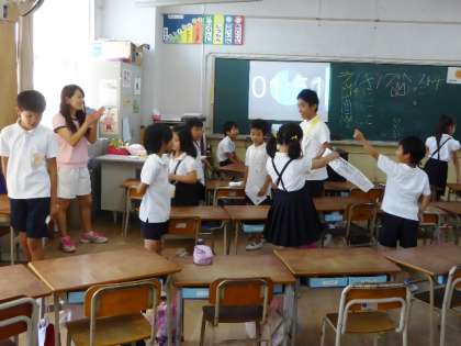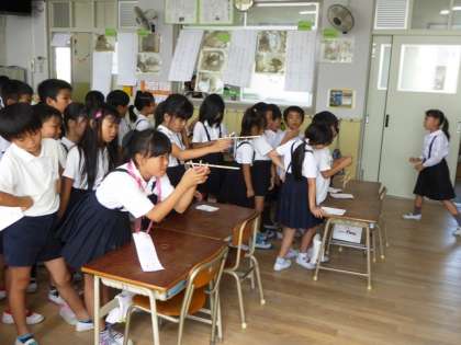 :低学年は少し前、ゴム鉄砲で小さな的に狙いを定め。