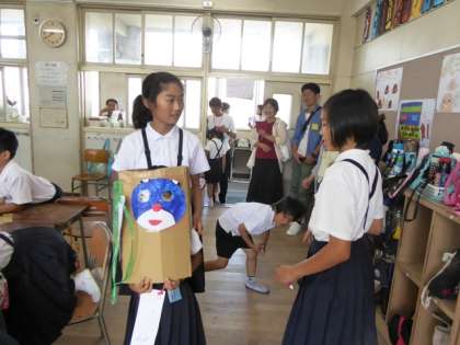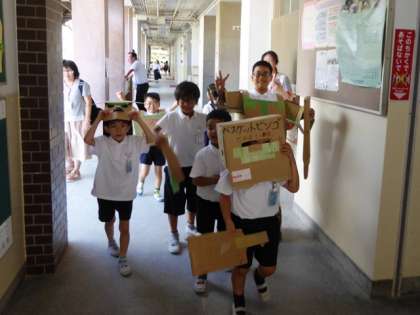 ところは、段ボールのかぶりもん。