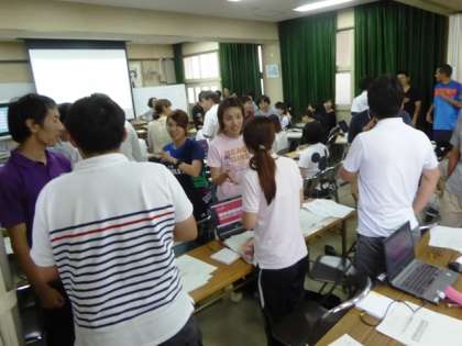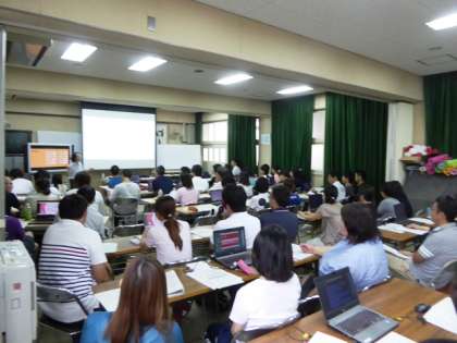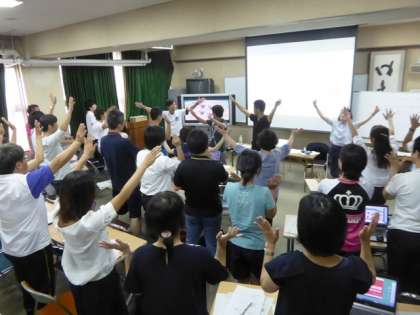 豊里南・豊新小学校との合同開催ということで、総勢70人を超える先生方が一堂に会しての大研修会。会場となった多目的室はエアコンが効かないほど熱気にあふれていました。