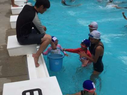 1年生は4学級 6年生は3学級と学級数が違うのですが、1年生の4学級に合わせて学級対抗でプールの底の宝(ゴム玉や輪)を拾い集めました。