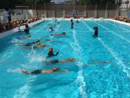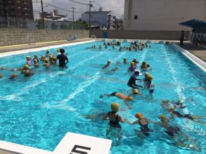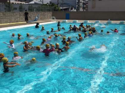 プールの底のゴムボールや輪を拾います。普段は水に顔をつけるのを怖がっている児童も、あら不思議・・・水中の宝をとっています。