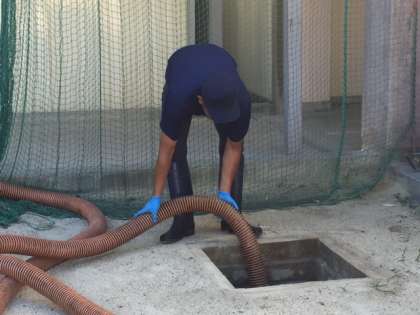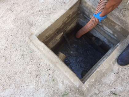 今回、排水管の通管作業をお願いしました。バキュームカーで管の中の砂(泥)をくみ上げます。これで少しは水たまりが解消するでしょう。