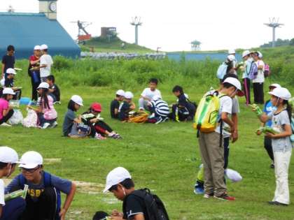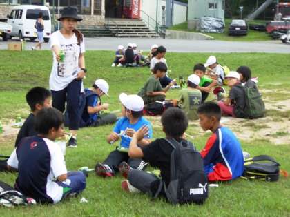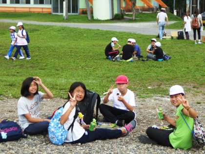 宿舎前の草地に三々五々に広がって、お弁当で昼食です。