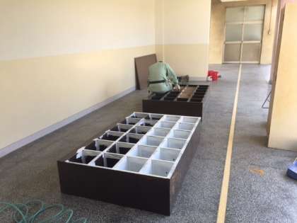その後、お盆を挟んで本校の井川管理作業員が一人で作業を続けていましたが、ほぼ完成のめどが立ちました。あとは下駄箱の塗装を残すのみです。「子どもたちが登校するまでには何とか仕上げたい」と残業も惜しまず取り組んでくれました。