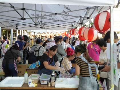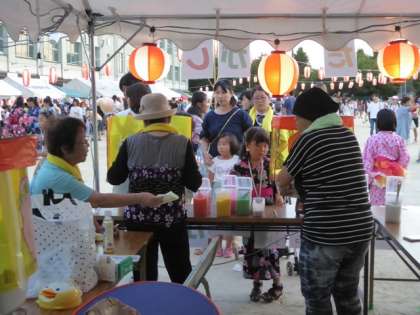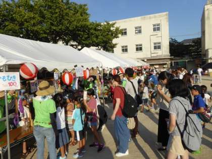 ●まだ暑さが厳しく、日の高い内から児童を含む、たくさんの来場者。PTAや地域の人たちのブースは熱気に包まれていました。