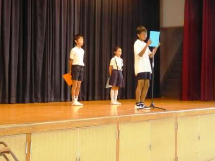 ○2枚目:5年生の児童が「2学期の抱負」を力強く宣言しました。